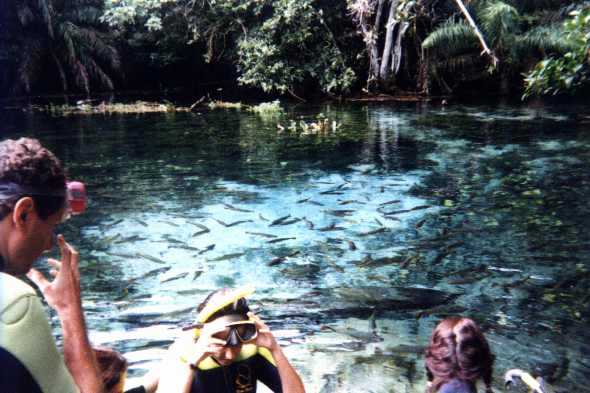 Chegamos num deck e finalmente tivemos a primeira visão do que é Bonito. É realmente redundante! Descendo por uma escada, a cerca de dez metros abaixo de nós, o Rio da Prata escorria sem muita pressa, com sua água azul e cristalina e seus inúmeros peixes: eram dourados, pacus, piraputingas, piaus-de-três-pintas, curimbatás, enfim, uma festa!