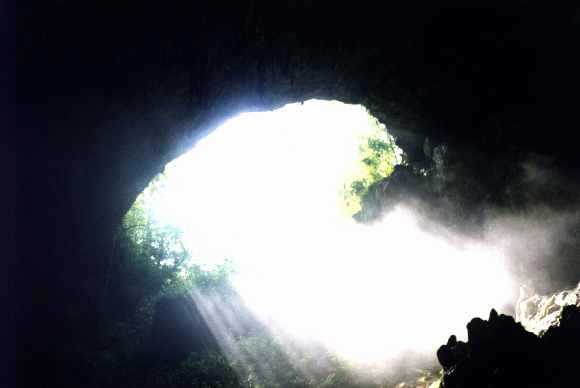 Chegando lá, já com guia nova, a Helena, descobrimos que a gruta já tem alguns milhões de anos, e que em suas águas é proibido entrar ou mesmo tocar. A paisagem é impressionante: cento e oito metros abaixo da boca da caverna (de acordo com a Helena... eu achei menos...), encontra-se a tal lagoa. Ainda era cedo, e a uma neblina saía da boca da gruta, que parecia ter acordado àquela hora!