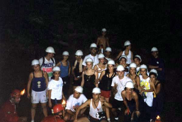 Depois comí um pouquinho de lanche de cada um, na verdade todo mundo foi compartilhando seu lanche....Daí resolvemos voltar e iríamos para a caverna da Água Suja (essa eu lembro o nome!!!!!!) Alguns já desistiram e foram embora para o camping mas como eu ainda tinha forças, continuei. Entrei na caverna com uma lanterninha que teria até vergonha de mostrar de tão pequena, mas depois até me orgulhei dela pois dava um banho de luz em um monte de lanternona cheia de frescura. Fui entrando e escorregando ao mesmo tempo. Na caverna descia um rio ( pelo menos acho que era ?????) que estava a pelo menos 20º abaixo de zero...Verdade....Meu pé congelava, mas a vontade de entrar era maior. E lá fui eu... até que chegou em uma parte onde você teria que mergulhar pois o teto quase encostava na água, nessa hora um monte de gente desistiu e eu, bem..., fui né? Quando ia mergulhar perguntei para o André (o nosso Guia) o que ia acontecer e ele me disse que eu teria o batismo! Mergulhei e... perdi minha lente! Mas tudo bem, o melhor da caverna estava lá: uma linda cachoeira. De repente o pessoal começou a voltar e eu perguntei o que era. Disseram que alí era o final e estavam indo embora. Foi então que a Esli disse que queria ver o final e lá fui eu junto. Eu, a Esli e o Fabrício. Fomos indo e indo e o negócio foi ficando legal. Alí não era o final. Na verdade ainda havia muito mais até que chegamos num ponto onde a caverna foi se fechado e ficou mais difícil ir adiante. O rio ainda congelava meu pé e colocamos naquele ponto o final da caverna e então vontamos. Ao sair da caverna retornamos a trilha, mas agora com um grupo bem menor poir muitos já tinham ido embora. Minha lanterninha já tinha ido além de suas pilhas e o resultado é que na volta, já escuro (lá pelas 8 da noite) fui tropeçando em tudo no caminho. Minhas pernas já não aguentavam mais. A parte de trás da coxa acho que laceou... Eu não conseguia mais levantá-la e aquela trilha não acabava. Chegando ao encontro do resto do pessoal no final da trilha eu não aguentava mais. Só que ainda havia mais um quilometro de subida (pra mim foram pelo menos uns 10 quilômetros) a pé até chegar ao ônibus. Eu simplesmente desabei quando cheguei lá em cima... Chegando ao acampamento tomei um mal banho e fui para a barraca e não ví mais nada até lá pelas 4 da manhã quando acordei. A calor dentro da barraca era insuportável e não conseguia mais dormir. Ao meu lado estava a Melissa, minha irmã e a Fernanda, minha prima. A barraca é destinada para três pessoas, ou seja, só dava para duas. Lembrei então que minha mama e meu papa estavam sozinhos numa barraca para 6 pessoas, ou seja, eu caberia tamém. Só de camisão, dei uma espiada para fora da barraca e não vi ninguém. Saí correndo até a barraca da mama e me refugiei lá (Obs.: Ela não reclamou não, viu!!!!!!!!!) Depois não me lembro de mais nada...