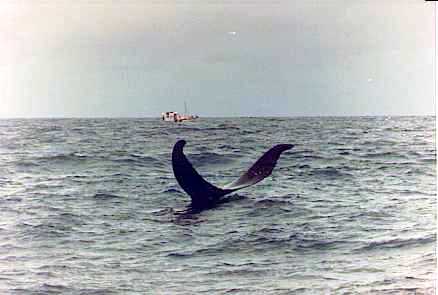 Mais ou menos meio dia, nossa primeira baleia! Um espirro forte a cerca de um quilômetro do barco a denunciava. Não dava prá ver muita coisa, mas era nossa primeira baleia, ora essa! Todo mundo de câmera na mão e o bichinho se afastou borrifando água pro alto. Vinte minutos depois, a vara de pesca que o Maurício deixara no corrico se verga e depois de certa briga, uma cavala de seus vinte quilos é colocada a bordo, limpa e devidamente guardada para apreciarmos sua carne dia destes.