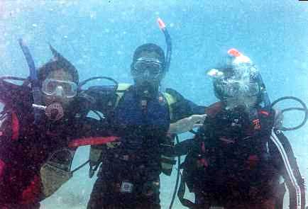 Lá era outro lugar barra pesada. Por ser entre duas ilhas, havia forte corrente e a ida no mergulho, que foi bem raso, não chegando a sete metros, era um bater de pernas só. A visibilidade não muito boa e a falta de vida mais exuberante condenava-nos a nadar e nadar. Apesar disso, ainda deu para a família scuba, Edmílson, Teresa e Camila, posar para uma foto sub...