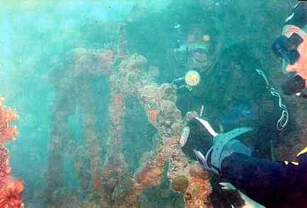 Gastei ar como um louco só para chegar ao porão do navio, onde a corrente já não era tão forte. Seguimos então a passear pelo se interior, às vezes passando por lugares mais escuros, onde as lanternas davam conta do recado. Nestes lugares, formam-se fluxos de água, que te arremessam prá frente, como num tobogã. Então, é mais adrenalina prá te fazer gastar mais ar. E ainda pode ser que você tope com um mero ou um badejo sarado que te dá um bom susto...