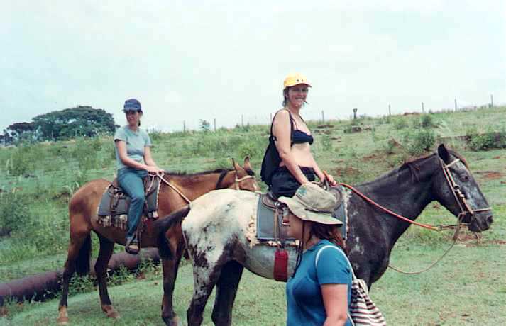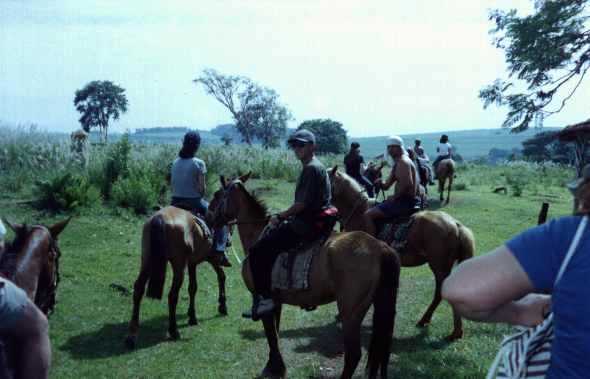 Tomamos café e lá fomos de volta à Fazenda Barcelos, onde um monte de cavalos nos esperava, nem um pouco ávidos pelo passeio. Chegando lá, cada um começou a escolher os cavalos e eu, que nunca tinha cavalgado, escolhi uma eguinha meia boca, de nome código A2, que apelidei de Egua Mille, com câmbio automático. Tinha provavelmente três marchas: devagar, quase parando e imitando lesma. Raramente resolvia andar um pouco mais rápido e meu “equipamento de sentar” doía cada vez mais a cada sacolejada. Logo na saída, a A2 foi para junto do grupo dela... que estava no curral! E lá fiquei eu, pagando mico, até que o peão Antônio veio tirar a mardita daquela situação...