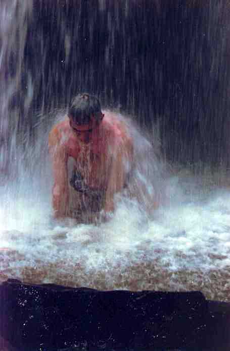 Chegando lá embaixo, você cai num laguinho, onde alguns já estavam meio sem ânimo para chegar no seco. O Maurício fazia questão de recepcionar e levar a todos para baixo da cachoeira, numa ducha monstruosa.