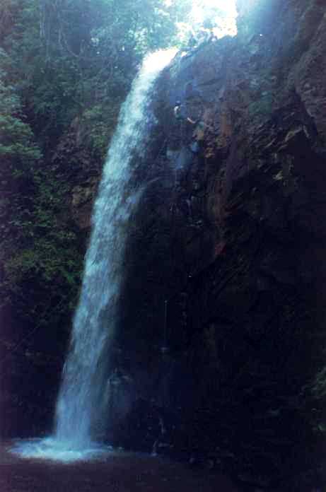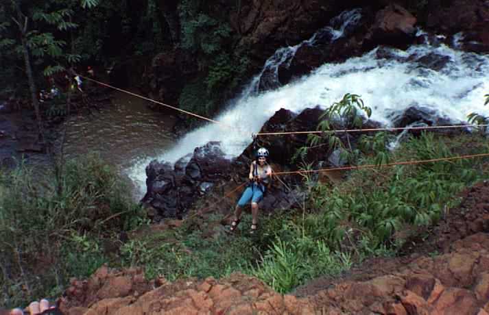 Consistia em descer uma cachoeira grande, de seus vinte e poucos metros, utilizando além da corda onde a cadeirinha ia presa, uma outra, guia, onde iríamos pendurados pelo auto-seguro. Definitivamente era alto. Já era hora de almoço e todo mundo nem aí com a fome. A angústia da espera aos poucos era substituída pela adrenalina da vez da gente, quando num impulso, ficávamos suspensos e ao nosso lado uma queda belíssima e abaixo, bem abaixo, de nós um lago marrom. A gente atravessava este lago e ia por os pés no chão só do outro lado, no seco. Legal à beça!