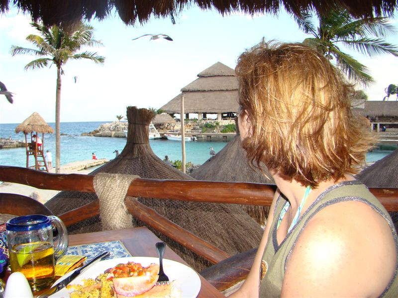 Então, vamos ao almoço. Comemos no Dos Playas, um dos vários restaurantes de Xcaret onde nosso pacote permitia comer. Ficamos em uma mesa com vista para o belíssimo mar do caribe, com gaivotas por perto e uma comida que dava prá perceber o quão frescos estavam os ingredientes. Tudo à vontade, se não tivesse certeza de que iria passar mal se comesse mais um pouco, eu tinha me acabado nos camarões e outras iguarias...