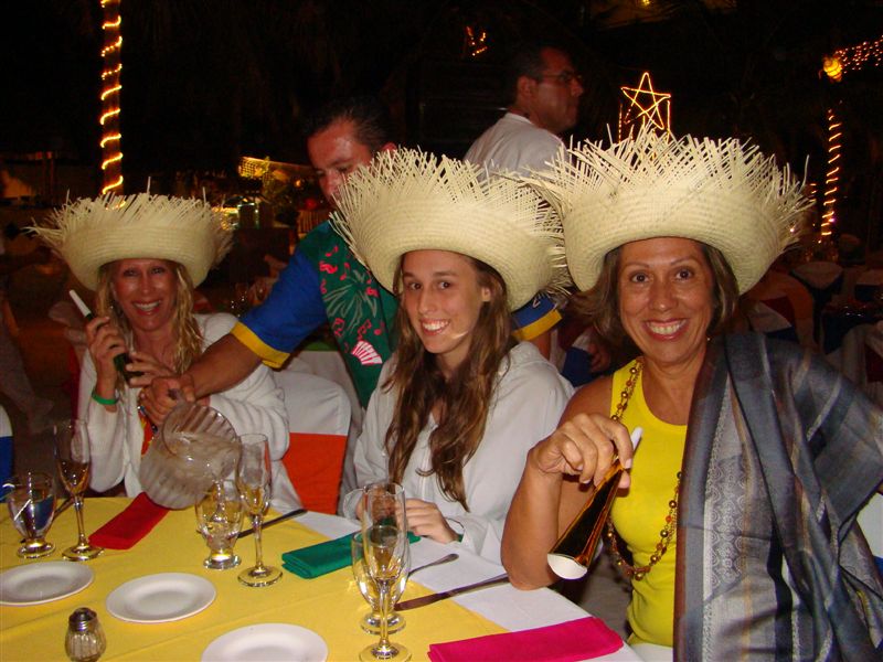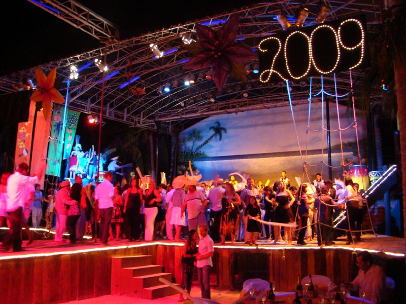 Chegamos em Isla Mujeres e nos sentamos em uma das muitas mesas que haviam por ali. Tudo decorado com o já tradicional kitsch mexicano, tudo muito exagerado e a gente cascando de rir. Bebida à vontade e comida servida em buffet. O show começou e foram apresentando danças típicas de vários países: África (sic), Argentina, Espanha e sua rumba (sic de novo), México, EUA e, claro, Brasil! Foi tudo menos música brasileira, mas combinava com o bizarro da ocasião. E, com certeza, era menos insólito que nosso reveillon do último ano, com os hippies...