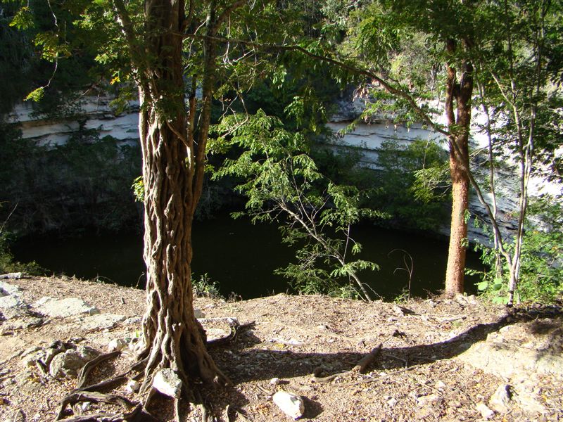 Chegamos lá. Um monte de gente ao redor do ônibus, uns caras querendo de qualquer maneira tirar uma foto sua prá colocar em garrafa de tequila e cadê o tal cenote? Tá logo ali... Olhamos de cima e... sabem o Piscinão de Ramos? Pois é.. temos aqui seu primo mexicano, o Piscenote de Ramos, ou de Ik-Kil ( que deve ser Ramos em maia... ).