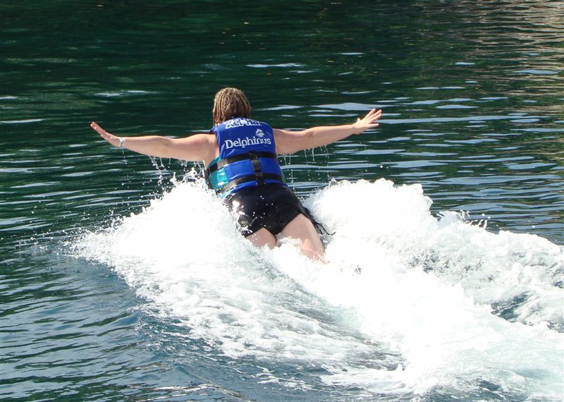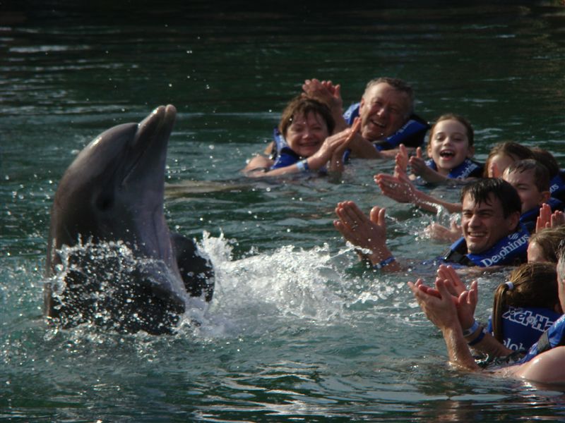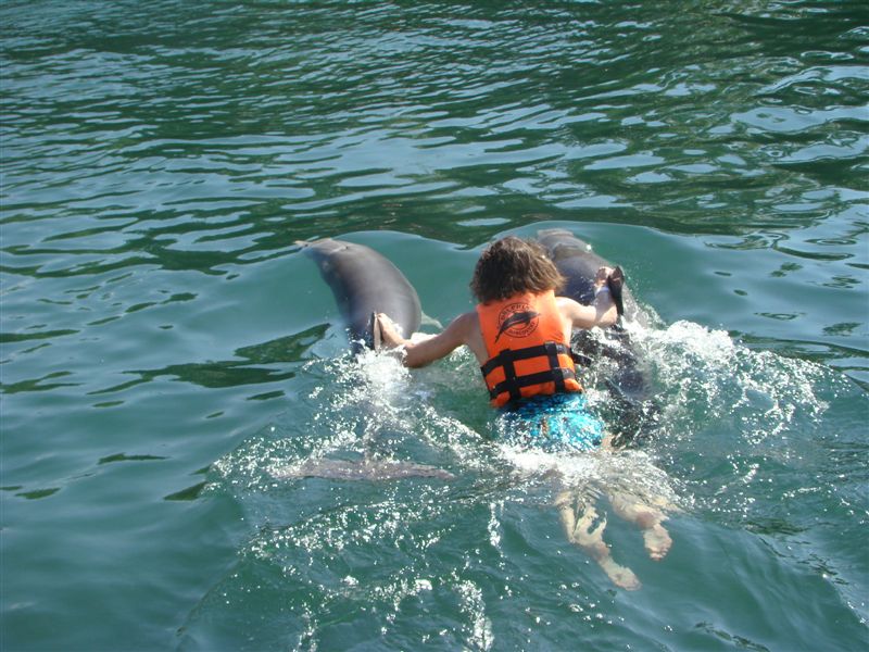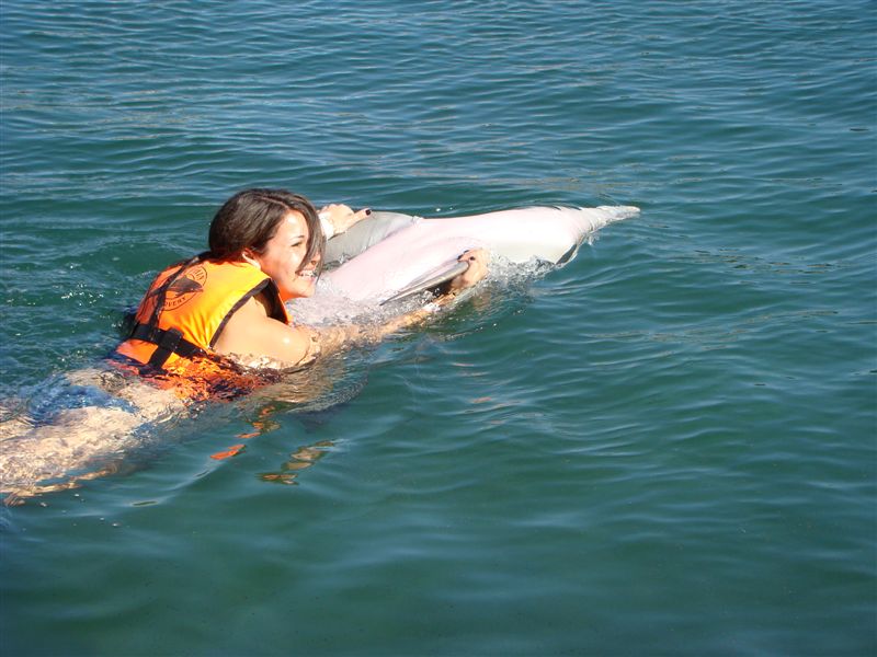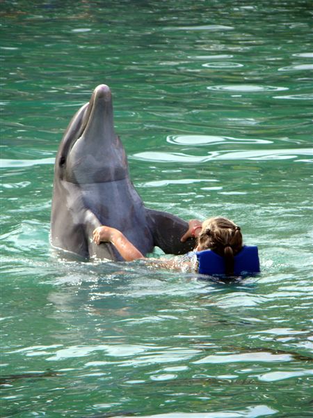 Entramos na água e lá estavam os "nossos" dois golfinhos, Nani e Angel. Os golfinhos de perto são bem maiores do que imaginamos, com quase três metros de comprimento. Começamos com um carinho no dorso deles, depois na barriga e logo já estavamos ganhando beijos e abraços e nos preparando para os dois pontos altos, o "foot push" e a carona. Dois a dois, íamos para o outro lado do tanque e, para a carona ficávamos em posição de crucifixo e, assim que os golfinhos passavam, agarrávamos as barbatanas dorsais ( a que fica fora d'água nos tubarões ) e por dez metros tínhamos uma carona deliciosa e a toda velocidade. Depois, o "foot push" era quando os golfinhos punham os focinhos em seus pés ( ainda bem que não fez cócegas!! ) e te empurram com força, de modo que você sai até os joelhos prá fora da água. A sensação é maravilhosa e faz parte da categoria "não dá prá explicar, tem que experimentar". Mais algumas brincadeiras com eles e fim de papo. Hora de conhecermos os outros atrativos da festa.