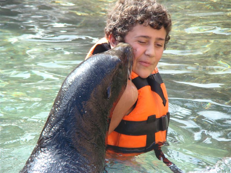 Ainda tinha mais! Os manatis não tinham saído do tanque e trouxeram a Luna, um leão marinho ( uma foca grande... ) que fazia acrobacias e nos dava beijos. Tudo registrado pelos fotógrafos que depois te cobravam 15 dólares cada foto!