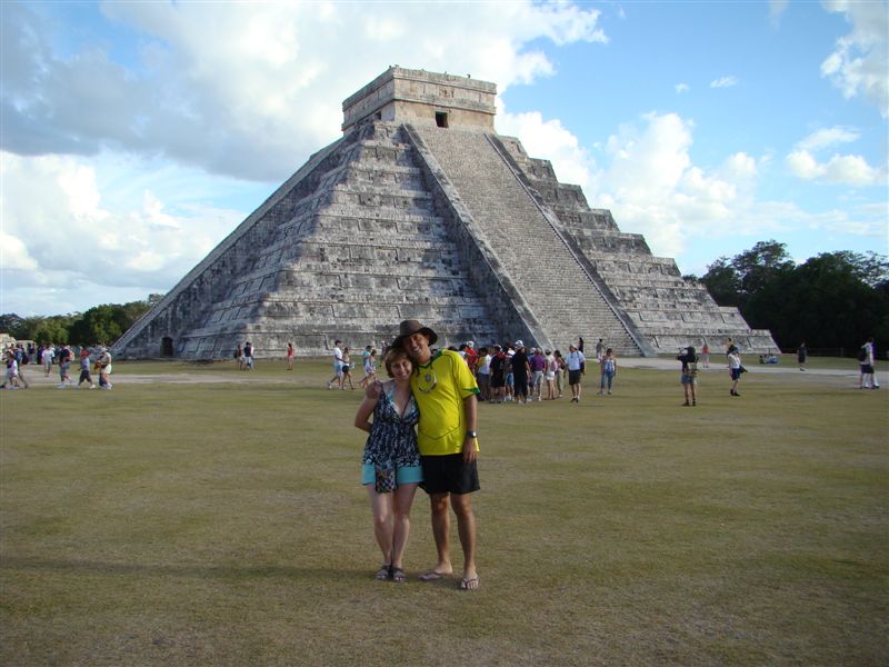 Finalmente, ela estava à nossa frente! Entramos em Chichen Itza e, depois da muvuca na entrada, estávamos perante a grandiosa pirâmide de Kukulcán, simbolo do sítio arqueológico e, apesar de ser menor do que eu imaginava, monumental. Na verdade, explicou-nos o guia, trata-se de uma pirâmide dentro da outra, como as matrioskas, aquelas bonequinhas russas. Quando se bate palma a uma certa distância da pirâmide, o som que se ouve logo após não é o eco, mas um barulho diferente, uma espécie de piar de pássaro. Estranhíssimo!! Em uma das faces, a famosa quetzalcoatl, a serpente emplumada, simbolo do deus supremo dos maias. Em um dia específico do ano, que deve ser um dos solstícios ou equinócios, a sombra do canto da pirâmide faz a cobra andar, descendo à terra! E numa noite de lua cheia, o efeito é o contrário, fazendo a serpente subir novamente aos céus.