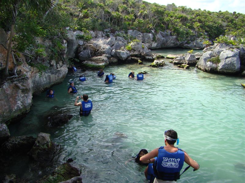 Você chega no início do rio, veste um colete salva-vidas, deixa os chinelos e a roupa seca em uma sacola, coloca mais uma chave no pescoço e entra na água gelaaaada!!! Mas acostuma rapidinho... O rio é muito bonito, bem claro e com vários peixes caribenhos, estilo "Procurando Nemo". A descida é muito tranquila, com a única preocupação de se desviar das bóias que descem o mesmo rio com turistas. Para se ver os peixes, é necessário ficar próximo às margens, porque no meio do rio só tem pedra e areia. Uma hora e pouquinho depois, você começa a chegar perto do mar e percebe um fenômeno chamados haloclinas, que nada mais é do que o encontro da água doce com a água salgada, que deixa a visão turva como se alguém tivesse misturado óleo na água. É interessante, mas você não vê nada, nem peixe, nem a pedra que você vai bater a cabeça... Aliás, o nome Xel-ha siginifica exatamente isto: o encontro das águas.