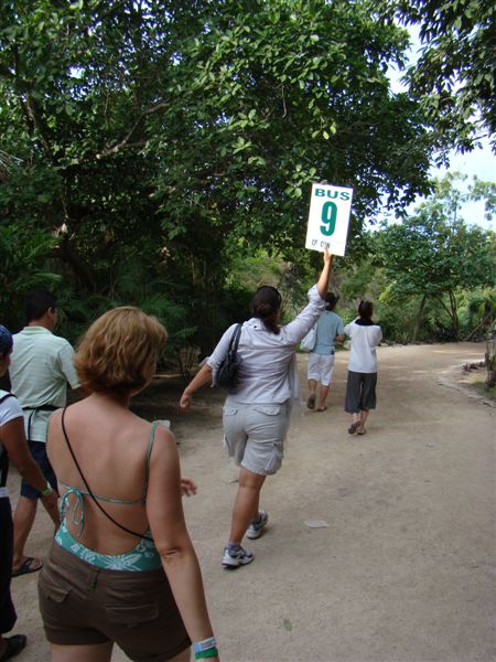 Chegando no ponto de encontro dos ônibus, em frente ao Wet'n'Wild, vamos ao ônibus número 9 ( todos os ônibus, para todos os passeios, têm cada um seu número e, se você esquecer, fica a ver navios...) e conhecemos a Sassa, nossa guia, muito simpática e divertida. Aproveitamos a viagem de quase duas horas até Xel-ha para nos ambientar e comprar protetor solar "biodegradável" a imensos 13 dólares. Tudo porque os parques não permitem que se use protetor que não seja biodegradável. Se for prá preservar, está ótimo. Bonito poderia usar esquemas assim, prá gente não torrer quando estivesse descendo o Rio da Prata e o Olho D'água...