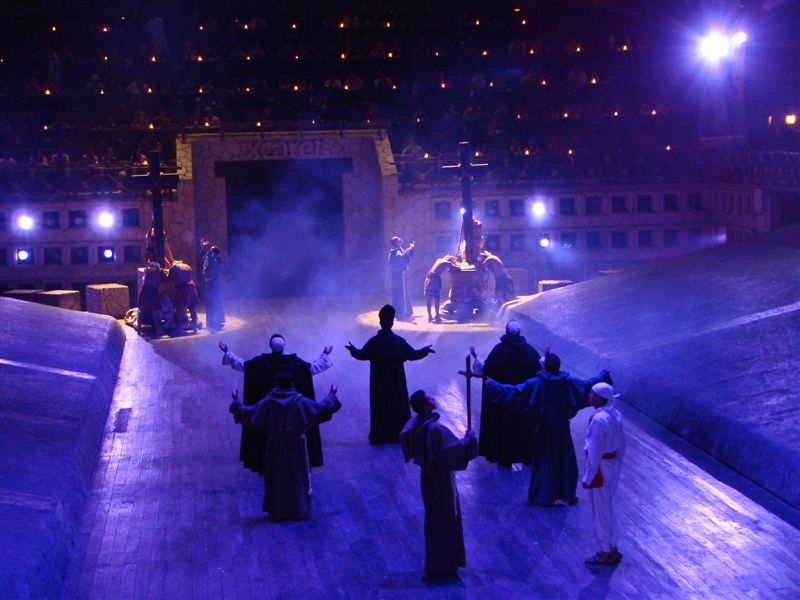 O estádio/ginásio/teatro (pode escolher) era bem grande, mas às cinco e vinte já havia muita gente lá. Conseguimos um lugar ótimo, com apoio para a câmera e esperamos a hora do show. Deram uma velinha para cada um, que deveria ser acesa no início do espetáculo. Aguarda mais um pouquinho, toma um refrigerante prá amenizar o calor e, às seis, não havia lugar prá mais ninguém no teatro.