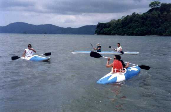 Um hora de remo por um mar calmo, que prá completar apareceram algumas nuvens que espantaram o sol e permitiram uma navegação sem tostar a moleira... Refestelados de enfrentar o Mar em Fúria, e suas marolas de vinte centímetros, voltamos com uma fome de tubarão, decididos a comer senão uma Jubarte inteira, pelo menos uma cauda de baleia, acompanhado de fritas. Tinha fritas, mas tivemos que nos contentar com filé de cação...