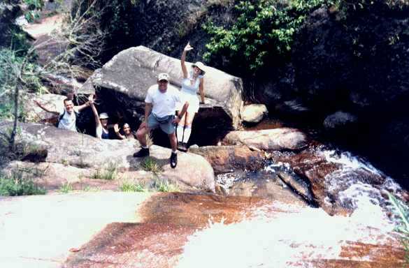 Estávamos nós, como calangos ao sol, quando de repente a Esli, num pulo, começa a gritar: Morango Louco! Morango Louco! Foi o gatorade sabor morango que, desalojado pela água, começava a correr pedra abaixo em direção a uma queda de seus três metros. O Eduardo só esticou o braço, pegou o maluquinho no pulo e jogou prá mim, que já não me aguentava de tanto dar risada com o escândalo da minha prima. A partir daquele momento, aquele lugar foi batizado como a Cascata do Morango Louco.