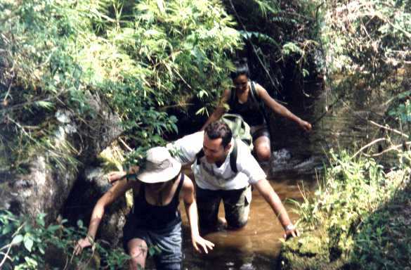 Meio frustrados, tentamos as bicicletas. Fui eu, o Du e a Rita, que por sinal acabava de descobrir que precisava pedalar nas subidas. Entre muita risada, o Luiz chegou e indicou prá gente o riozinho que tinha alí perto, onde podíamos entrar na água. Literalmente, entramos numa fria! O pé doía só de ficar na água e o banho começava a ser alternativa inviável, mas dava prá dar muita risada!