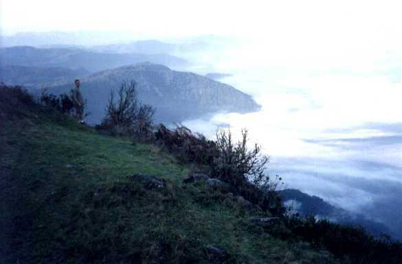 De repente, no meio de tanta chuva e nevoeiro, o sol aparece e as nuvens somem! Subindo tanto a montanha, a gente passa a camada de nuvens e parece que estamos em outro mundo. O pessoal de shorts e camiseta e a gente todo agasalhado e molhado, que nem naqueles sonhos esquisitos...