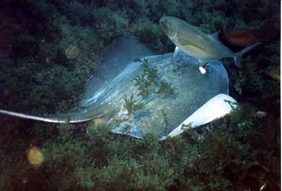 O segundo mergulho foi na parte de fora da Rata, para a gente pegar o que eles chamam de drift, uma corrente entre duas ilhas que é como um rio em que você se deixa levar. Chegamos a quinze metros e durante quarenta minutos curtimos a paisagem, com moréias, arraias, um linguado muito maluco, muitas barracudas e zilhões de peixes. Duas grandes âncoras cheias de cracas completavam a paisagem deste drift, que estava meio com pilha fraca, mas mesmo assim muito legal.