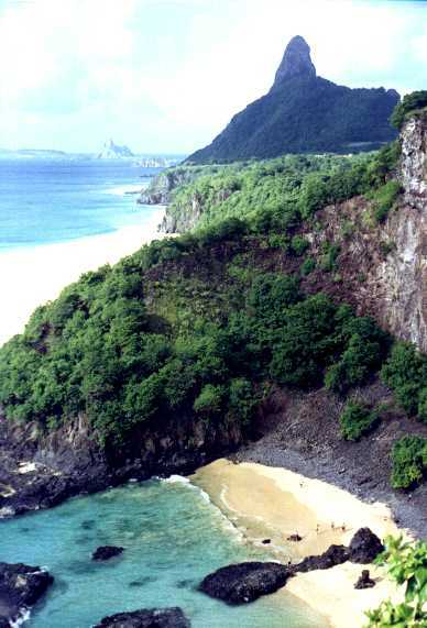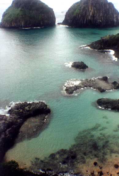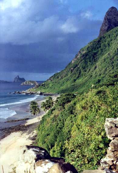 Após uma chuvinha já no mirante, comecei a percorrer a Trilha dos Golfinhos, que ia até a Baía dos Porcos. O que eu vi foi uma sucessão das praias mais bonitas que eu já observara em minha vida. Dos mirantes a cerca de trinta metros de altura, nas falésias, a Baía do Sancho é maravilhosa e a Baía dos Porcos é indescritível! Pelo nome, acho que deve ter sido uma burrada enorme se alguém já usou aquele lugar para abrigar porcos... Cartão postal da ilha, os Dois Irmãos completavam a paisagem desta maravilha. No Sancho ainda tem os lances de escada entre as rochas para ter acesso à praia. Desci e fotografei a cachoeira, que só nesta época chuvosa aparece.