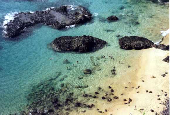 A trilha mesclava passagens com barro até as canelas com outras de pedras e mais pedras. O visual belíssimo fazia a gente esquecer qualquer coisa e assim, três horas depois, passando pela caverna do Capitão Kid, chegamos nas Caieiras, que também tinha suas piscinas. O problema era que o mar estava meio virado, e as ondas estavam passando por cima dos arrecifes, o que tornava perigoso o banho. Ficamos a admirar a paisagem e tirar fotos das ondas e dos aratus, aqueles caranguejos avermelhados, que por ali faziam sua convenção.