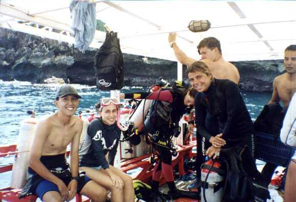 Apresentado à “tripulação” do barco, o dive-master Lisandro já fazendo o tal de briefing, para explicar o roteiro de mergulho, uns golfinhos acompanhando a gente por um tempo... Foi vestir o equipamento e pular nas águas claras e mornas para entrar num mundo totalmente diferente de tudo que eu já tinha experimentado!