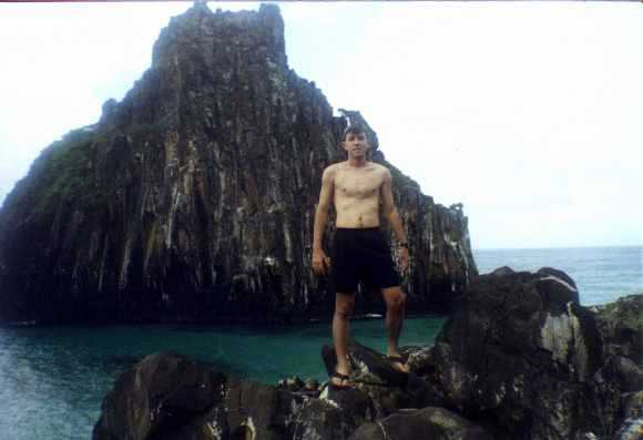 Depois, no segundo mergulho do dia, caímos no Buraco do Inferno, um dos nomes mais descabidos que eu já vi para um lugar! A menos que estivessem querendo fazer propaganda enganosa do inferno, não entendi o motivo: uma gruta com apenas uma partinha de seu topo não inundado, que quando a onda vinha soltava um bufo com um spray de gotinhas (talvez daí o nome...), mas que quando dentro dela, era uma gruta com uma cortina de peixes barrigudinho, maravilhosa, com um espaço dentro dela que você podia respirar sem o regulador. Saindo do tal buraco, continuamos com a parte rasa da cordilheira. Um mergulho light, onde a chegamos somente até quinze metros e durante quarenta minutos ficamos a ver peixinhos, arraias e barracudas. Tão light que quase perco minha câmera na hora de embarcar! Ao tirar o colete, a câmera escorregou da mão e começou a afundar. A Paula, que não é boba nem nada, percebeu e rapidamente pegou a câmera e, como pedágio, tirou uma foto dela mesma e passou a câmera para mim... sem perceber que eu não sabia que ela a passara e lá vai a câmera de novo ao fundo! O Ceará tinha ido prá baixo procurar a câmera e qual não foi seu susto ao ver a dita-cuja descendo calmamente até ele... Mais um pedágio, e minha câmera estava salva!