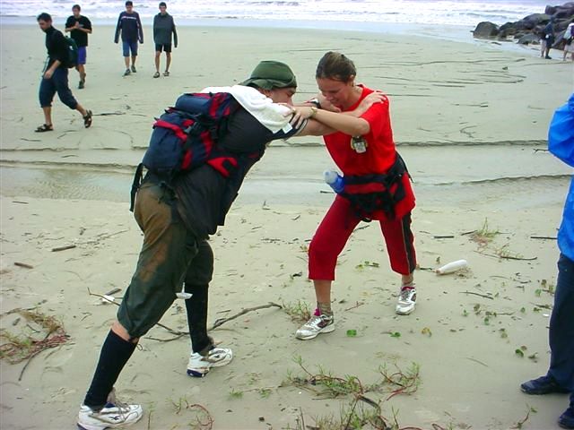 Último dia e, sabendo que a escuna zarpava às nove, acordamos às sete e toca desmontar acampamento. Café da manhã ao mesmo tempo do desmonte. Barracas guardadas molhadas mesmo e tudo meio socado prá não perder a hora e nem a esportiva por ver tanta areia grudada em tudo.