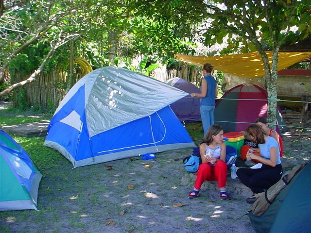 As outras escunas, que tinham zarpado depois da nossa, passavam alegremente por nós, e Marujá custaaaava a chegar. Depois de quase quatro horas, as primeiras casinhas apareceram no meio do manguezal e meia hora depois a gente chegava no trapiche. Desembarcar? Não! O danado do barqueiro resolveu deixar primeiro o pessoal que ia ficar um pouco mais à frente. Detalhe: não tinha pier ali, e a gente ficou esperando por uma hora até todo o pessoal e toda a bagagem ser transportado até a terra em botes. O bom humor pedindo licença para sair e o barqueiro ainda não sabia onde era o nosso camping, o Camping do João Rosa.