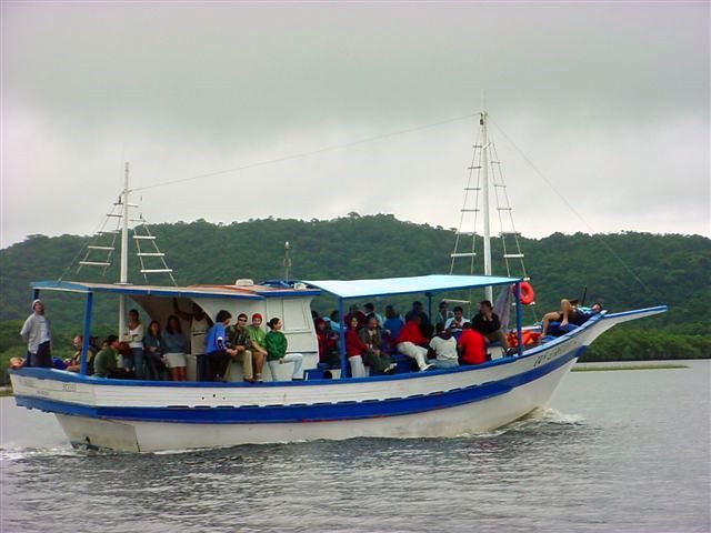 Chegamos por volta de seis da manhã em Cananéia, descarregamos os carros e rapidinho pegamos um lugar na segunda escuna que partia. Seria uma viagem de duas horas e meia a três horas, até a comunidade de Marujá, uma vilinha de pescadores no início da restinga da Ilha do Cardoso. Era longe prá caramba, mas a gente estava passeando mesmo... quem se importa com o tempo?