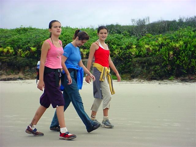 A faixa azul já tinha sumido e a ameaça de chuva era grande... Estávamos com as câmeras protegidas e decididos a encarar a brincadeira: no total eram vinte e quatro quilômetros, entre praia, floresta, montanha e barro, até um lugar chamado Piscinas da Lage, no meio da ilha do Cardoso. Com tempo bom seria difícil. Com tempo ruim, tornava-se um batismo para a Juliana e a Gabriela, na sua primeira incursão à aventura. As duas, com seus onze anos, estavam com uma carinha de será-que-vai-chover engraçada, não tendo idéia do que o dia poderia reservar.