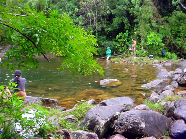 Quatro horas depois de sairmos do Marujá, chegamos às tais piscinas. São três no total, mas a chuvinha fina querendo fazer vítimas e o frio cortante que imperava deixou só o Eliel, louco por uma água, entrar. Ele colocou seu óculos de natação e (ele vai me matar...) protegido pela capa de gordura, se arremessou na piscina natural, formada pelo rio Cambriú. A gente ficou comendo, tentando repor alguma energia e se aquecer um pouco.