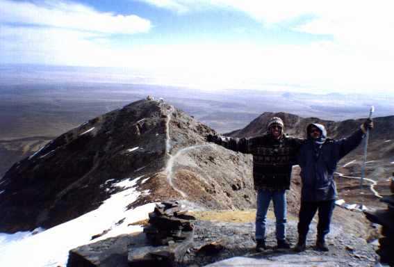 A van penava para subir a montanha e nos deixou a 5200 m. A estação de esqui de lá ficava a 5300 m. e subimos, super-agasalhados até o cume. Gente! Cansa prá caramba! Pouco ar e muito frio. A orelha doía, assim como o pulmão. Os passos são curtinhos, curtinhos, mas enfim conseguimos chegar ao cume e tirar "milhares" de fotos com neve, sem neve, com pedra, sem pedra, etc. Voltamos rápido para não ficarmos apunados, ou sorochados ou o nome que queiram dar para o mal de altitude...