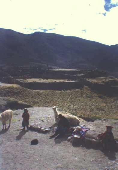 Um subida chata e chegamos ao centro que é a própria vila. Um poste indicava direção e distância a várias cidades do mundo e nativos teciam à soleira de suas portas, naquela pracinha bucólica. Turistas esmeravam-se em fotos e resolvemos subir até umas ruínas acima, num trajeto meio cansativo, prá variar. Aliás, tudo era fisicamente cansativo, e a altitude dava mostras que estava sempre por ali, a apanhar os incautos.