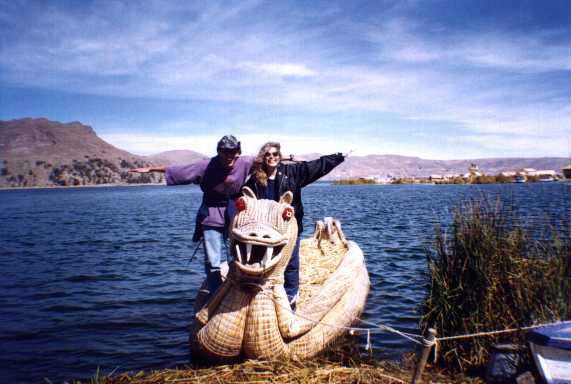 Entramos no nosso barco, parecido com uma chalana, com gente do mundo inteiro (prá variar...) e quase uma hora depois aportávamos em uma das ilhas Uros, feitas de totora e que flutuam pelo Titicaca. Apesar de feita para turistas, o pequeno povo que mora naquelas ilhas faz tudo com totora (uma espécie de junco), desde os barcos até o chão onde pisam. Muito legal. Ah! A gorjeta, ou propina, é palavra de ordem. Quer tirar foto no barquinho? Propina! Quer tirar fotos das crianças? Propina!
