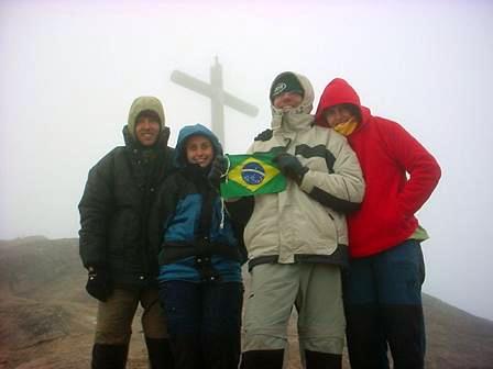 Para quem subia com a intenção de ver o nascer do sol, pura decepção. A claridade aumentava, indicando que o sol estava por ali, mas o que mandava mesmo era aquela neblina espessa... Mas para quem veio curtir uma aventurazinha, era prato cheio! Estar a quase três mil metros, num frio congelante, e chegar a ver em meio à neblina o cruzeiro que marca o Pico da Bandeira é super legal... Chegamos com a claridade bem acentuada, mas o frio continuava. Curtimos a não-paisagem, tiramos algumas fotos com uma bandeira que a gente tinha trazido, porque Pico da Bandeira sem a dita é muito chato, e toca a descer, para lugares menos frios.