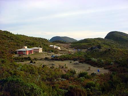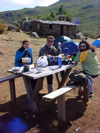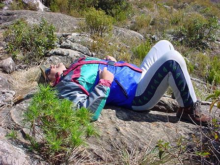 Meio dia, hora de almoço, e a gente viu que tinha sido bom trazer um pouco mais de peso, com mais mantimentos e mais tranquilidade. Almoçamos salada de atum com maionese e pão sírio, e depois papeamos um pouco com o Rogério, um guia do Anjos da Montanha, que faz excursões por aquelas paragens. Conversa vai, conversa vem, e ele nos contou das guerrilhas que ocorreram por ali, dos aviões que caíram (tinha uns restos de fuselagem num canto...), das tempestades elétricas que assolam o lugar no verão e dos que se perderam por aqueles lugares. Estava divertida a conversa e o Eduardo e o Luizinho ficaram conversando mais com ele, enquanto eu fui puxar uma siesta.