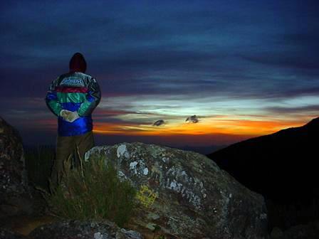 A madrugada foi movimentada! Aquela galera estava resolvida a não dormir e a ir para o Pico da Bandeira naquela noite. É impressionante o volume de barulho que um bando de quarenta adolescentes pode fazer! Num momento ficavam quietos e ao menor wow (algum grito de guerra, penso eu) vários wows eram ouvidos dos lugares mais improváveis. Duas da matina deu vontade de ir ao banheiro e ao redor dele o chão estava forrado de pequenos embrulhos de cobertor, provavelmente com algum infeliz morrendo de frio dentro!