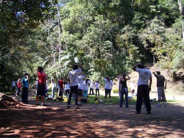 Antes da trilha, um monte de aquecimento dado pelo Negão, um dos três guias. Os outros eram o Nilton e o Jânio. Pessoalmente, odeio aquecimento, então, fingi de morto e fiquei tirando umas fotinhas, hehehe. Todos ou quase todos aquecidos, rumo à trilha!