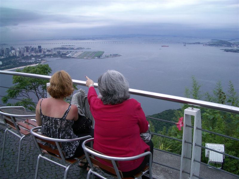 O Pão de Açúcar é bacana. Primeiro você faz uma primeira perna até o Urca, o morro mais baixo e depois pega a segunda perna de bondinho até o Pão de Açúcar propriamente dito. Lotado de estrangeiros, com alguns saguis pedindo comida, uma lojinhas de recordações, o ponto turístico merece a fama de simpático. Além de tudo, há uma vista fantástica do Rio de Janeiro, onde a ângela sentou-se com a Mon e ficou explicando tintim por tintim cada um dos pontos turísticos do Rio que dava prá ver lá de cima.