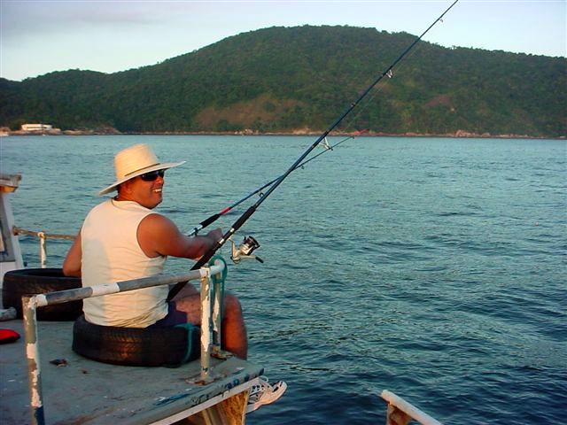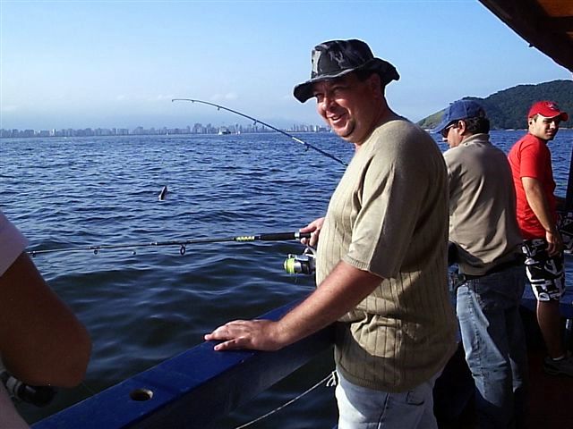 Quem tava acordado começou a ficar empolgado, porque os peixinhos começaram a beliscar. Estávamos há cerca de quinhentos metros da costa e enquanto os peixinhos não vinham, a gente ficava vendo os cargueiros, os iates e lanchas que passavam, alguns malucos de caiaque e canoa havaiana, enfim, mais distração que lá no meio do mar.