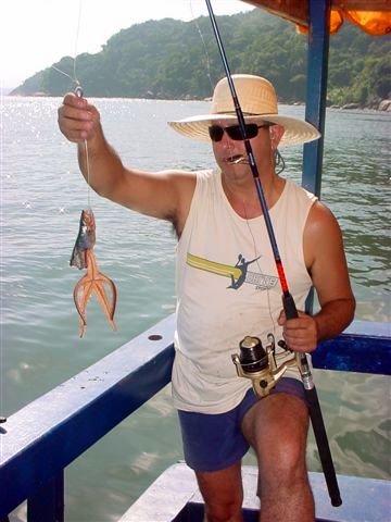 O Odenir pescou uma estrela do mar, o Paulo uma arraia, o Reinaldo tentava acertar com a chumbada um caranguejo chato, mas nada de peixe grande...O maior foi o Vitor, o ajudante do Felipe, que pegou: uma pescada de seu quilo e meio.