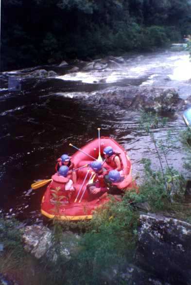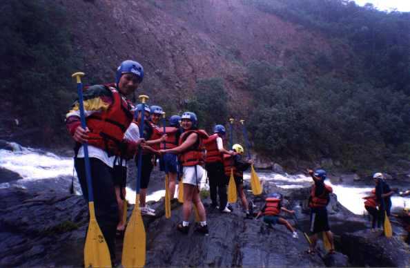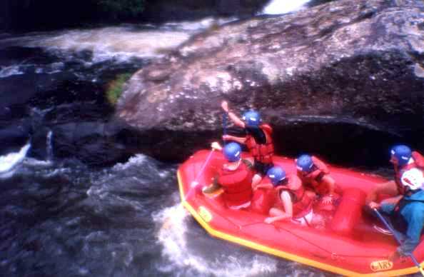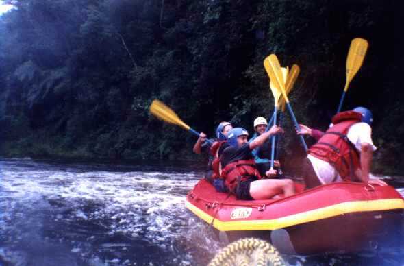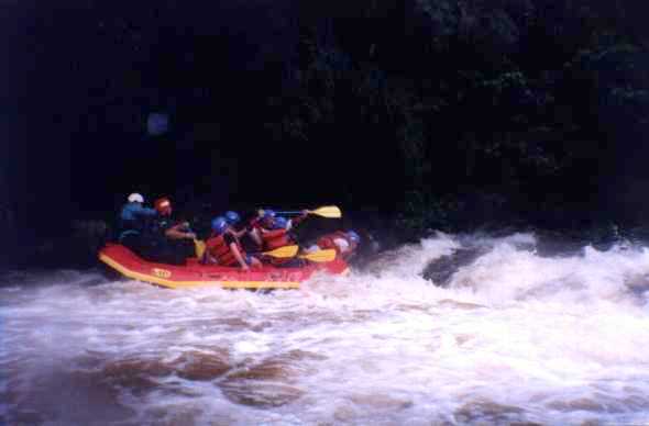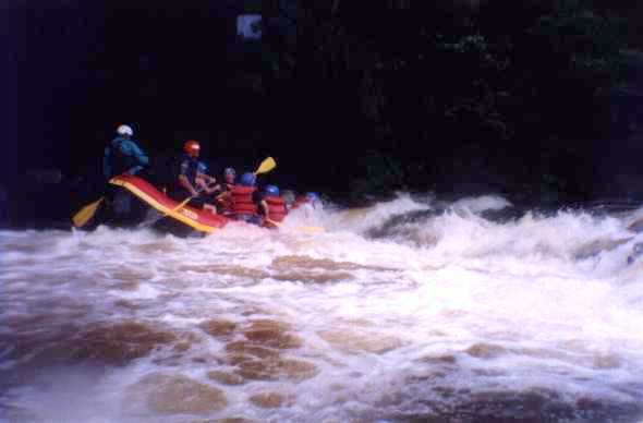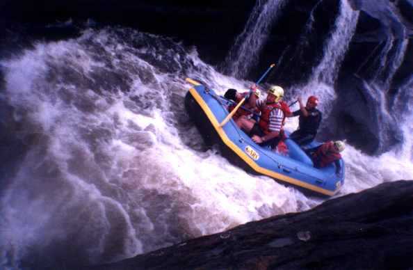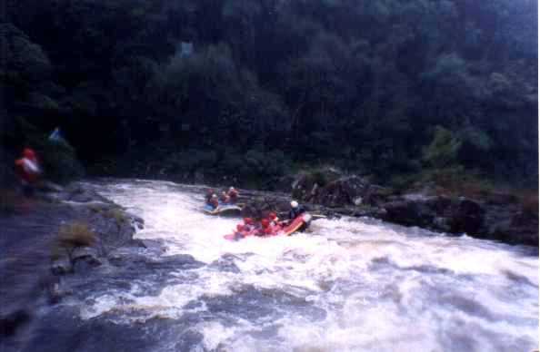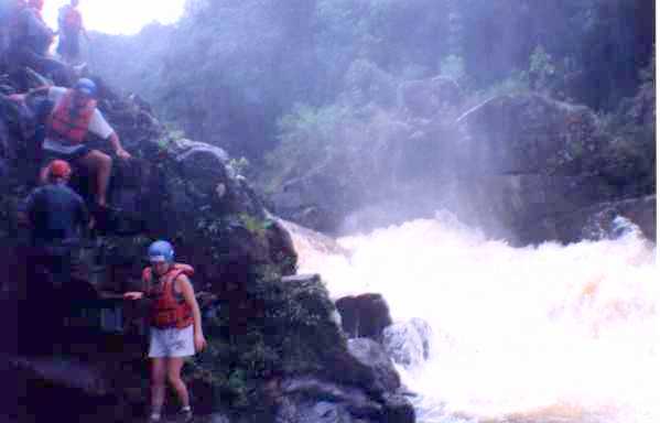 Após algumas tentativas frustradas, o Guto entrou junto no barco para dar mais peso e o Roberto correu para a posição de carranca, esticando-se para fora do barco com a cabeça na cachoeira. Ao grito de "Frente! Muito forte!", a gente gritava feito malucos e remava feito pinel, isto é, eu e o Lee remávamos... O Régis e o Guto ficavam pulando no outro lado do bote para fazer contrapeso, a Marina e a Loo gritavam feito doidas e o Roberto firme na sua carranca. A cachoeira estava muito forte e era difícil ficar muito tempo ali, mas o pouco que ficamos foi muito legal. Batemos os remos acima, para comemorar e fomos embora.